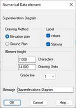 Label: Indicates whether one wishes to label both the stations and the superelevation values. These controls are only valid should the superelevation be in the elevation drawing.