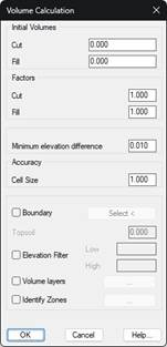 When executing the command, the program first displays a dialog where you can enter some Initial Volumes of cut and fill, which the program adds to the final result of the calculation. Factors can also be introduced that multiply the volumes obtained.