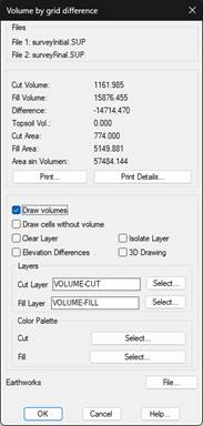 By enabling the box Draw Volumes, a graphic representation can be obtained of the results which consists of a mesh defined solely in the area where both mesh files are defined. Each cell will have a color indicating whether the area is being cut, filled or does not have a volume which falls within the tolerance defined in the configuration. There is the possibility of assigning in the drawing a range of colors both for the cut and fill; with this in mind, we have the option of selecting the corresponding color palette.