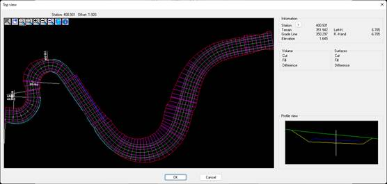 Surfaces: In this section it displays the cut and fill surface of the current station. Additionally, it shows the difference between them.