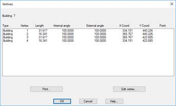 Among other data, the length of each side is shown, as well as the coordinates of each vertex.