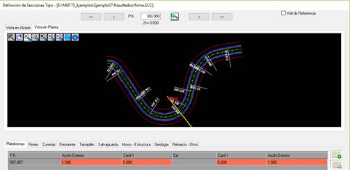 Simulación en Planta: En este apartado configuramos el intervalo de representación de la sección en planta tomando como referencia el pk actual, de esta forma, si establecemos el valor a 200 y nos encontramos en el pk 300, se visualizará la sección en planta desde el pk 100 al 500.
