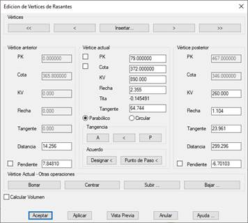 Este comando nos va a permitir modificar los acuerdos de la rasante. Una vez ejecutado el comando MDT solicita el vértice a editar, visionándose tanto las características del actual, como las del vértice anterior y posterior. A continuación se describen las características del diálogo.