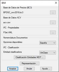 Desde este apartado tenemos la posibilidad de configurar los ficheros y bases de datos utilizados para la gestión de la exportación a BIM. Para más detalle, consultar el apartado BIM del Manual de Referencia.