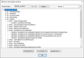Base de Datos de Precios (BC3): Seleccionamos la base de datos de precios que utilizará el programa por defecto. Es un fichero con extensión BC3 y su utilidad es la asignación de las Unidades de Obras a los distintos componentes generados en el software (Superficies, capas de firmes …).