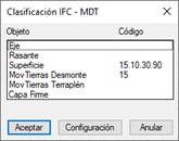 IFC- Clasificación: Entidades clasificadoras disponibles para la posterior asignación a los distintos elementos de MDT. Al presionar el botón “Clasificación Entidades MDT …” disponemos de la posibilidad de realizar las correspondientes asignaciones según la entidad clasificadora seleccionada.