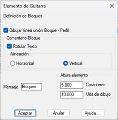 Dependiendo de cómo estén configurados los bloques, se insertan bien como un elemento de guitarra más (modo Guitarra) o sobre el perfil dibujado (modo Terreno). Seguidamente se muestra el diálogo y se detallan las características del mismo.