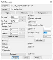 Una vez designadas las líneas, nos aparecerá el diálogo de generación de perfiles transversales, en el mismo sería necesario especificar una Longitud del Perfil a izquierda y derecha suficiente para que incluya toda la zona ade actuación, asimismo, es conveniente aplicar un intervalo de generación pequeño para que la bocina a crear tenga la máxima resolución.