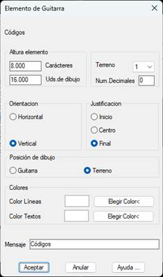 Este elemento de guitarra rotula los códigos del perfil longitudinal correspondiente al corte en el que se encuentra. Si se representa algún corte que no existe en el longitudinal (caso de representación por intervalos) MDT le asignará el código inmediatamente anterior. Seguidamente se muestra el diálogo y se detallan las características del mismo.