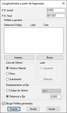 Cotas de Vértice: Indicamos desde que fuente de información deseamos generar las cotas del nuevo perfil a generar. Pudiendo seleccionar entre las cotas del terreno natural, de la rasante o de la subrasante en el caso de existir firme en el segmento definido.