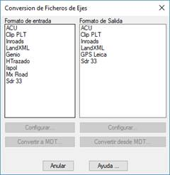 Con este comando podemos realizar la conversión de ficheros de ejes de otros programas o con otros formatos distintos, con objeto de importarlos en MDT o exportarlos a otros programas Al ejecutar el comando nos aparece el siguiente diálogo que a continuación pasamos a describir: