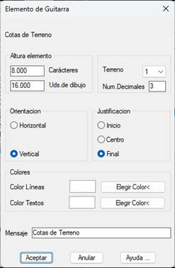 Este elemento de guitarra representa las del terreno del perfil longitudinal que contiene el segmento seleccionado. Seguidamente se muestra el diálogo y se detallan las características del mismo.