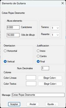 Este elemento de guitarra sólo se dibujará en el caso de que en el segmento exista una rasante definida. Representa las cotas rojas de desmonte de la rasante con respecto al longitudinal que contiene el segmento seleccionado. Seguidamente se muestra el diálogo y se detallan las características del mismo.