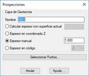 Este comando permite añadir información de una capa geotécnica a un conjunto de puntos. Concretamente, en cada punto se almacena la profundidad de la excavación que hay que hacer para llegar a la parte superior de la capa. En primer lugar aparece una ventana en la que se puede especificar el nombre de la capa, y cómo se va a calcular la profundidad: