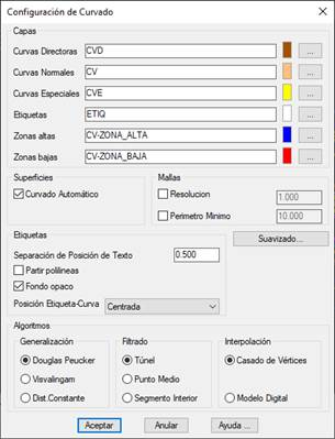 29.7. Curvado Permite configurar los parámetros utilizados en las herramientas de generación y tratamiento de curvas de nivel.