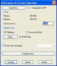 Las opciones son idénticas a las del comando , salvo que ahora sólo se especifica una Cota a curvar, en vez de un intervalo. El funcionamiento del comando es de carácter iterativo, o sea, una vez generada la curva de nivel especial, el comando vuelve a ejecutarse para indicar otra curva de nivel especial, este proceso se repite hasta que se pulsa el botón Anular.