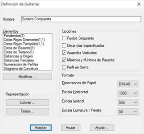 Con la ejecución de este comando define el usuario interactivamente la composición de la guitarra que desea. En este comando definimos las guitarras tanto para los longitudinales como para los transversales. Una vez que accedamos a Longitudinales > Definición de Guitarra, aparecerá la siguiente ventana de diálogo: