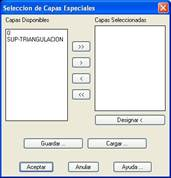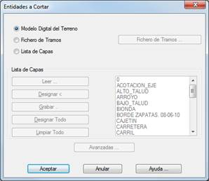 Listado de Capas: mediante esta opción se permite cortar con cualquier elemento de dibujo con elevación, lo que resulta muy útil para trabajar con cartografía digitalizada sin necesidad de crear grandes ficheros de superficies. Para ello se señala con el cursor las correspondientes capas cuyos elementos están representados en 3D. Puede incluirse también en la selección el modelo digital, marcando la capa TRI. La activación de esta opción habilita el cuadro Listado de Capas, mediante el cual se permite seleccionar las capas donde se encuentra la información 3D.