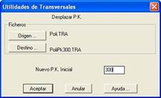 Esta opción nos permite modificar los puntos kilométricos o distancias a origen de un fichero de perfiles transversales. Tras seleccionar el archivo a modificar, el programa pide su nuevo P.K. inicial. Si introducimos un número distinto al propuesto, el programa lo toma como origen y modifica todos los valores de la primera columna del fichero.