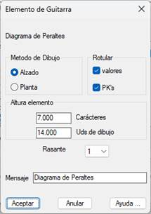 Este elemento de guitarra sólo se puede representar en caso de haber seleccionado un segmento. Calcula el diagrama de peraltes del eje que tiene asociado el segmento y lo dibuja. Seguidamente se muestra el diálogo y se detallan las características del mismo.