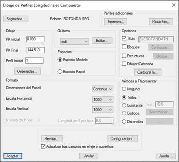 Presentación en pantalla de un segmento (ver comando Ejes > Segmentos), es decir, la posibilidad de dibujar un perfil completo con toda la información de rasantes, peraltes, longitudinales, curvatura, etc. Si se pretende dibujar solamente el terreno, usar el comando Longitudinales > Dibujar Perfil Compuesto.