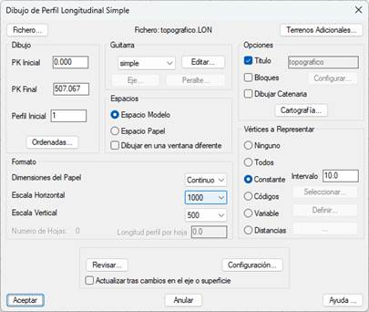 Tras validar esta ventana, nos aparecerá el siguiente diálogo en el cual gestionaremos los parámetros para el dibujo del longitudinal.