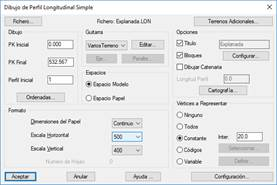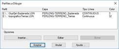 Una vez seleccionados nos aparecerá el diálogo habitual de dibujo, ya comentado anteriormente en el comando de “Dibujar Perfil Simple”, con la diferencia de que si presionamos el botón de “Terrenos Adicionales…” nos aparecerán los ficheros seleccionados así como su configuración de dibujo.