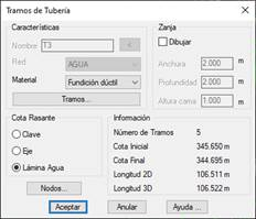 Al ejecutar el comando, se designará secuencialmente los nodos a través de los cuales discurrirá el tramo de tubería a crear. Una vez seleccionado todos los nodos nos aparecerá la siguiente ventana donde se especificarán las características del tramo de tubería a definir.