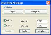 Esta utilidad tiene por objeto generar una serie de vértices intermedios en las polilíneas seleccionadas. Pueden especificarse las entidades a procesar pulsando el botón Capas o bien pulsando Designar y seleccionando por los métodos estándar de designación.