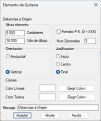 Este elemento de guitarra representa las distancias al Pk inicial del longitudinal que se va a representar. Seguidamente se muestra el diálogo y se detallan las características del mismo.