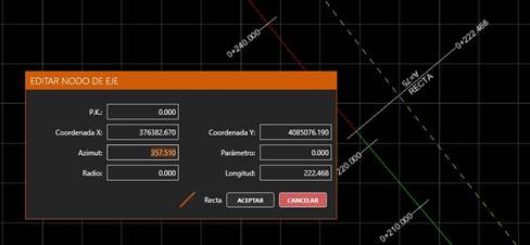 · Longitud: Longitud del tramo. Se puede editar, salvo que se esté definiendo una clotoide con radio distinto de cero.