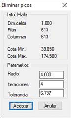 Radio: Define el área máxima ocupada por el pico. Para picos formados por un solo vértice será suficiente con un radio equivalente al tamaño de celda, en otros casos será necesario ajustarlo acorde con el tamaño de la zona a limpiar. Por defecto, el programa propone un tamaño de cuatro celdas.