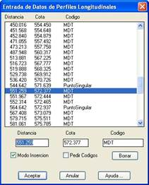 Posibilidad de introducir o modificar un perfil longitudinal elemento a elemento. Una vez ejecutado este comando se nos pedirá un fichero tipo .LON, y a continuación aparecerá una ventana de diálogo con los datos del perfil en caso de que existan, o vacía si este no contiene aún datos.