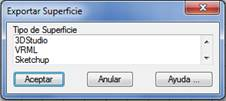 Este comando permite exportar la superficie actual a un fichero utilizable por otros programas. Primero aparece un dialogo en el que se elige el tipo de fichero a crear, y a continuación se solicita el fichero destino.