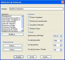 Editamos el tipo guitarra que se va a representar en el dibujo del perfil longitudinal. Por defecto está seleccionada la guitarra SIMPLE.GTR. Para cambiar la guitarra seleccionada por defecto se debe acceder a la configuración (ver Manual de Personalización).