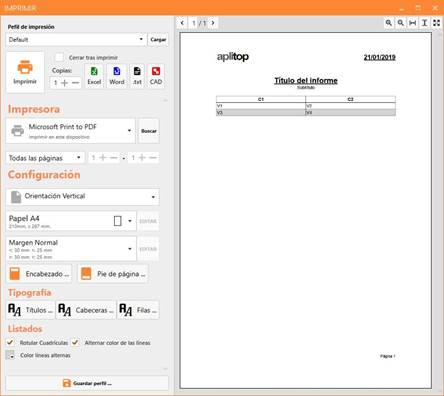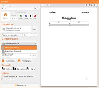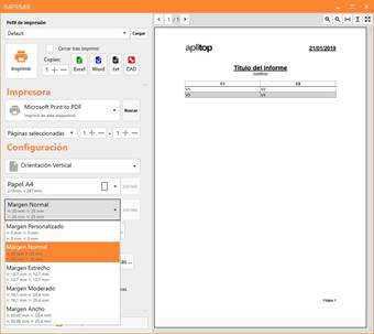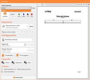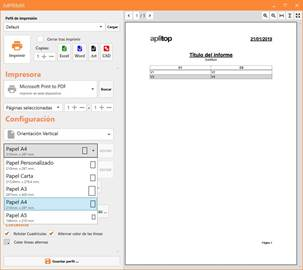 Perfil de Impresión: Permite seleccionar una configuración de impresión, previamente guardada, que se podrá cargar para restablecer dicha configuración: encabezados, tipos de letra, tamaño de página, márgenes…