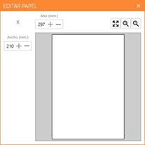 Permite seleccionar el tamaño del papel, hay algunos tamaños predefinidos pero es posible definir manualmente el tamaño del papel. Al seleccionar Papel Personalizado se activará el botón EDITAR, donde podremos acceder al editor del tamaño de papel y definir el ancho y el alto (en milímetros):