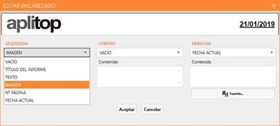 Permite definir el encabezado y el pie de página del documento. Se pueden definir tres bloques: izquierda, centro y derecha. Los posibles valores de cada bloque son: