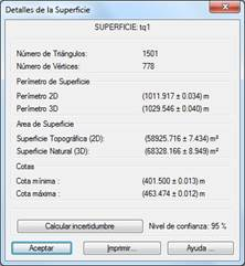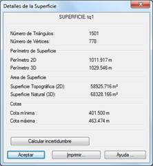 La ejecución del presente comando devuelve una ventana informativa en la que se indican los datos básicos de la superficie. Dicha ventana recoge, primeramente, la denominación de la superficie, el número de vértices y el de triángulos que constituyen la malla correspondiente a dicha superficie, los perímetros de la malla (perímetro 3D) y de su proyección horizontal (perímetro 2D) y las áreas tanto de su superficie natural (3D) como de la topográfica (2D). Adicionalmente se muestran las cotas máxima y mínima de dicha superficie.