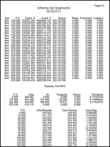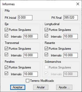 Podemos indicar los pks entre los cuales deseamos generar el listado y para cada uno de los elementos del segmento si queremos volcar la información de los puntos singulares o si deseamos el informe con un intervalo determinado.
