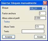 Bloque: Bloque a insertar. Estos bloques los lee el programa de la carpeta C:\MDT5\Bloques\Alzado. Por lo cual si deseamos insertar un bloque propio, debemos previamente haber copiado el mismo a la carpeta anterior.
