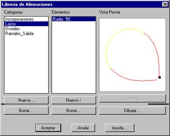 Existe la posibilidad de crear una librería de alineaciones, en la que se pueden almacenar distintos grupos de elementos de trazado. Estos elementos se pueden recuperar fácilmente en nuevos dibujos.