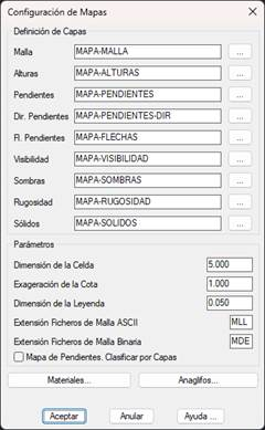 29.20. Mapas Muestra los parámetros de configuración para los comandos de dibujo de malla 3D, mapa de pendientes y mapa de alturas.
