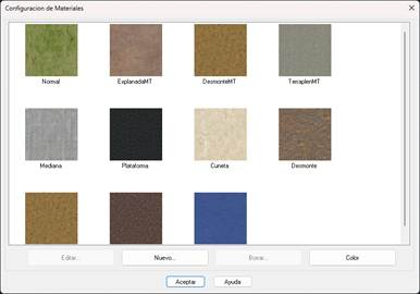 Establece los materiales a utilizar por los diferentes comando que se encuentran en el submenú Mapas/Realismo. Consultar el Manual de Referencia para más información.