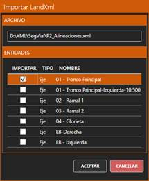 Abrir: Solicita un fichero EJE o LandXml y lo incorpora al panel y al visor CAD. En caso de que se importe un fichero LandXml con múltiples ejes definidos, se mostrará el siguiente diálogo para seleccionar el eje a importar:
