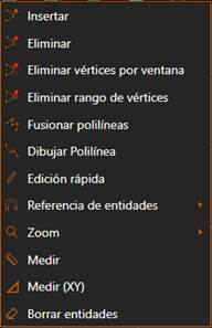 Las operaciones de edición solo aparecerán cuando hagamos clic derecho sobre una entidad. Dichas operaciones de edición son las mismas del Menú Edición de la barra de herramientas, si las usamos desde este menú evitamos tener que designar la entidad al comenzar el comando, puesto que ya se conoce la entidad sobre la que se desea actuar.