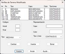 A través de este botón se accede al diálogo para configurar los elementos de perfiles de terrenos modificados utilizados para la generación de los mismos y para el dibujo de sólidos. Esta información se almacena en el fichero Secciones\CodSec.dat dentro del directorio Config.