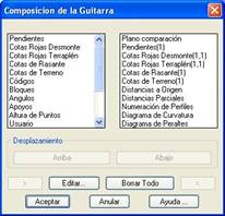 En el diálogo aparecen dos listados, el de la izquierda que nos muestra los elementos que hay disponibles y el de la derecha donde se muestran el estado actual de nuestra guitarra, el orden de este último listado es con el que aparecerá en el dibujo. En la parte inferior existen una serie de controles que nos permiten configurar la guitarra.