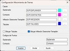 Muestra un diálogo para seleccionar los nombres de las capas donde se dibujan las polilíneas resultantes del movimiento de tierras.