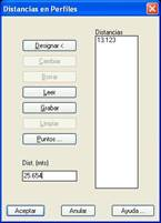 Distancia. Esta opción permite incluir en el perfil longitudinal determinados puntos kilométricos. La activación de esta opción habilita el botón, Distancias. Con ello se accede a una nueva ventana titulada Distancias en Perfiles.